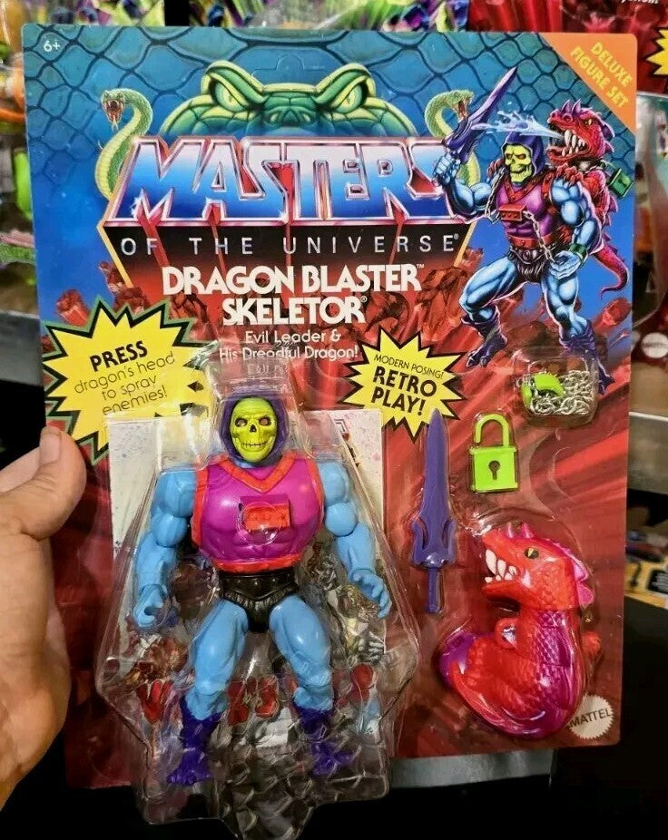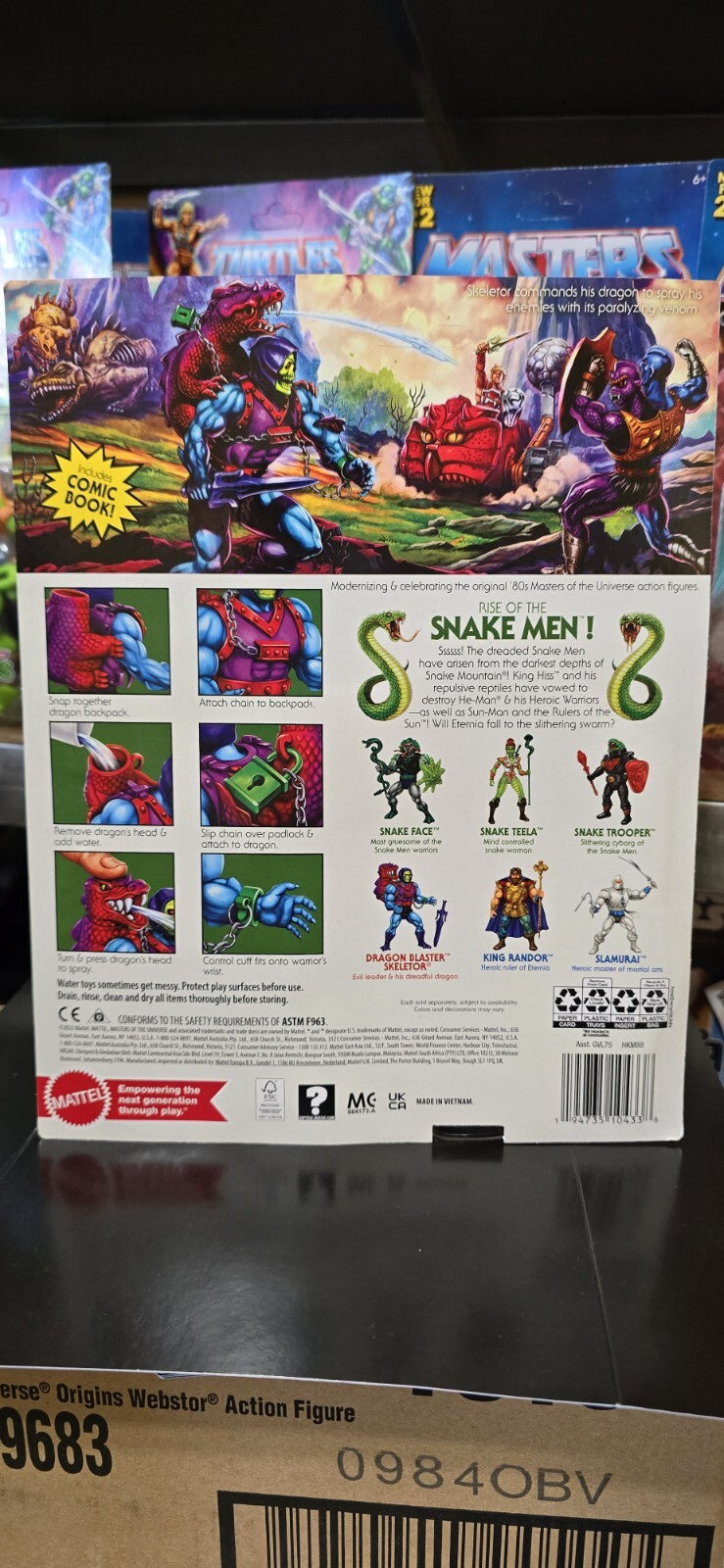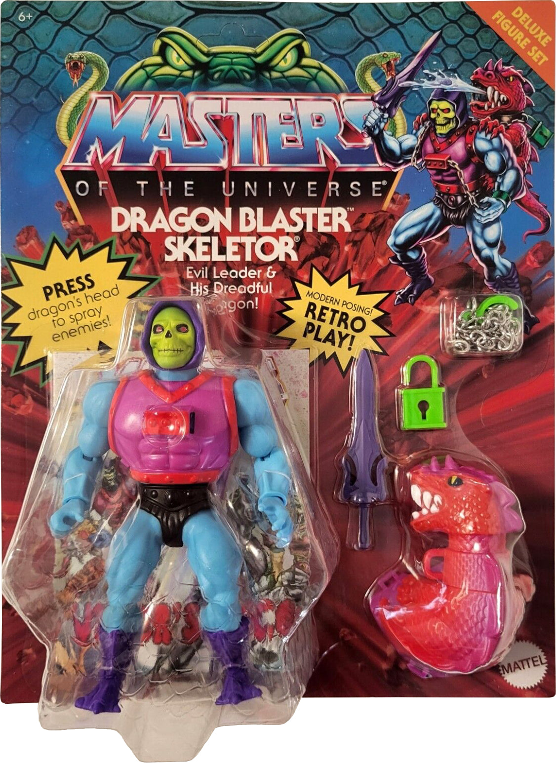Introducing the Masters of the Universe Origins Deluxe Dragon Blaster Skeletor action figure, manufactured in 2022 by Mattel. This limited edition figure features an adjustable design and is presented in its original packaging, unopened and ready to display. The figure is part of the Masters of the Universe franchise and is a 1:10 scale replica of the iconic character, complete with his belt and snake-themed vehicle.