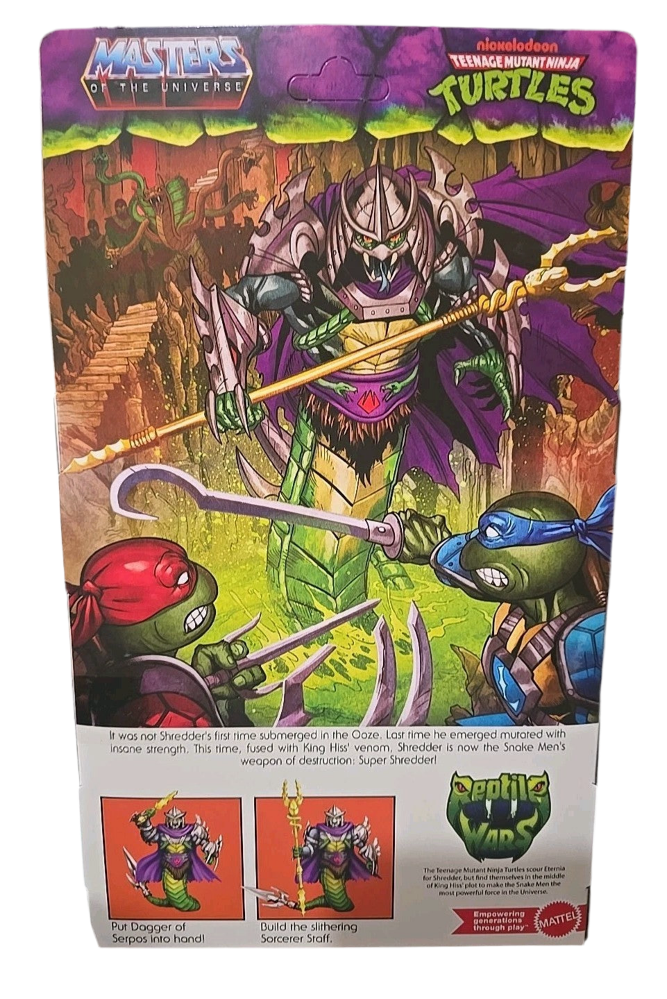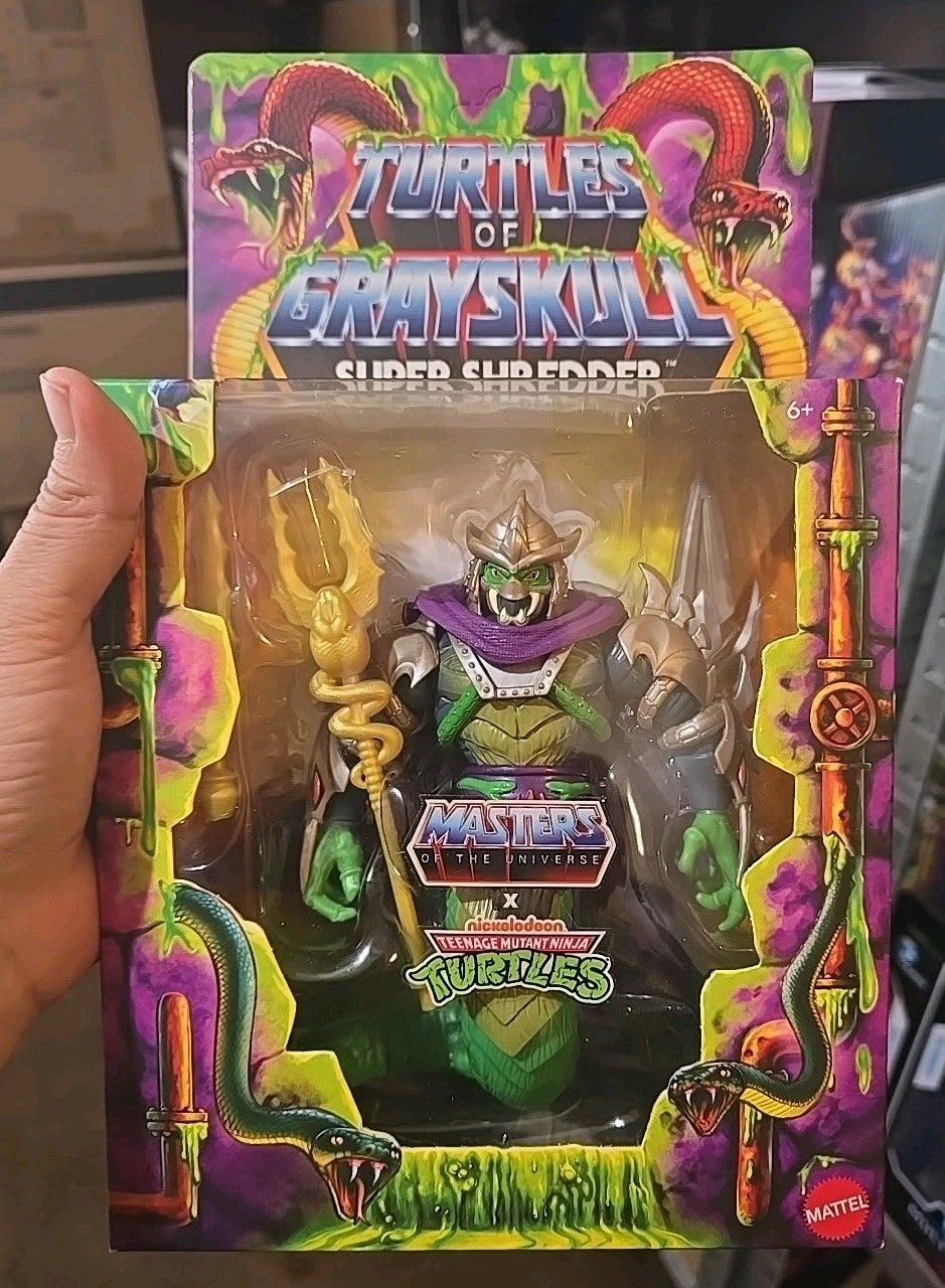 The product is a deluxe Super Shredder action figure from the MOTU Origins Turtles of Grayskull series, manufactured by Mattel... Leer más...