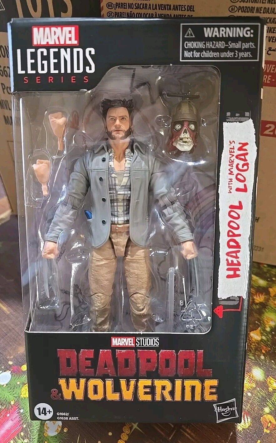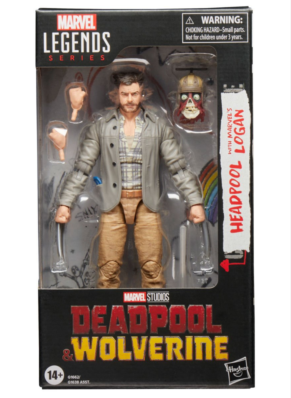 Marvel Legends Deadpool & Wolverine Action Figure features Logan with Headpool, standing 6 inches tall. This original, unopened collectible is based on the Marvel TV show and movie characters. It is an adjustable plastic figure from the Marvel franchise, specifically the Marvel Legends series. The action figure is designed for ages 4 and up, representing characters from the Marvel Comics genre.