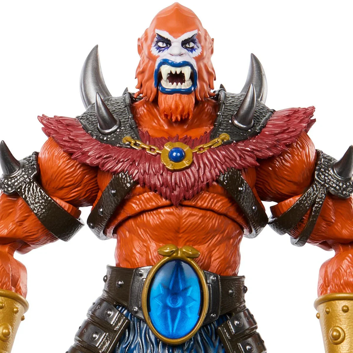 This Masters of the Universe New Eternia action figure of Beast Man is designed at Masterverse 7-inch scale with 30 points of articulation. This collectable MOTU beastly villain includes "jeweled" armor which is inspired by the early sketches of Beast Man. It includes an elaborate horned shoulder harness, belted hip armor and arm and wrist armor, all removable. A hinged jaw lets him really show off his fangs in fierce poses, along with mace and whip accessories. Skeletor's right hand supervillain comes beautifully packaged in a window box suitable for display. This New Eternia Beast Man makes a great gift to start or build a MOTU collection. Ages 6 and up.