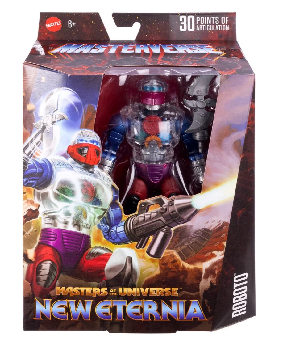 This Masters of the Universe New Eternia action figure of Roboto is designed at Masterverse 7-inch scale with 30 points of articulation, including his jaw. This collectable MOTU robot warrior includes his signature clear torso and helmet showing his internal robotics. A dial on his back activates the robotics! His gloved forearm can be swapped with 3 arm attachments – a blaster, a claw and spinning bladed weapon. This warrior robot rebuilt by Man-At-Arms comes beautifully packaged in a window box suitable for display. New Eternia Roboto makes a great gift to start or build a MOTU collection. Ages 6 and up.