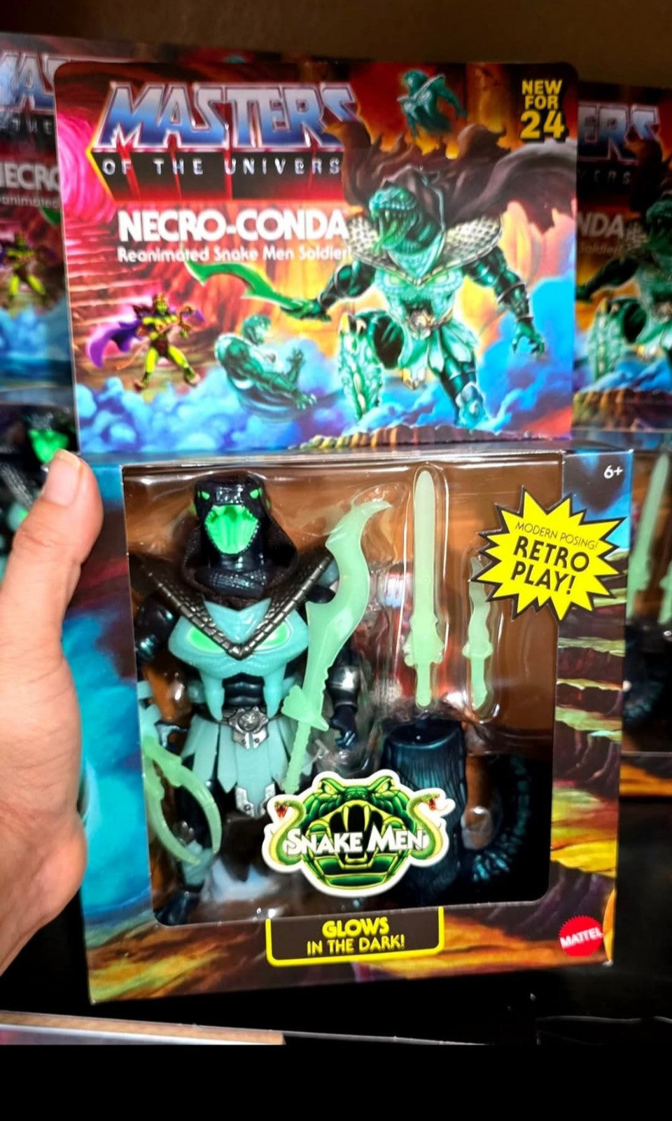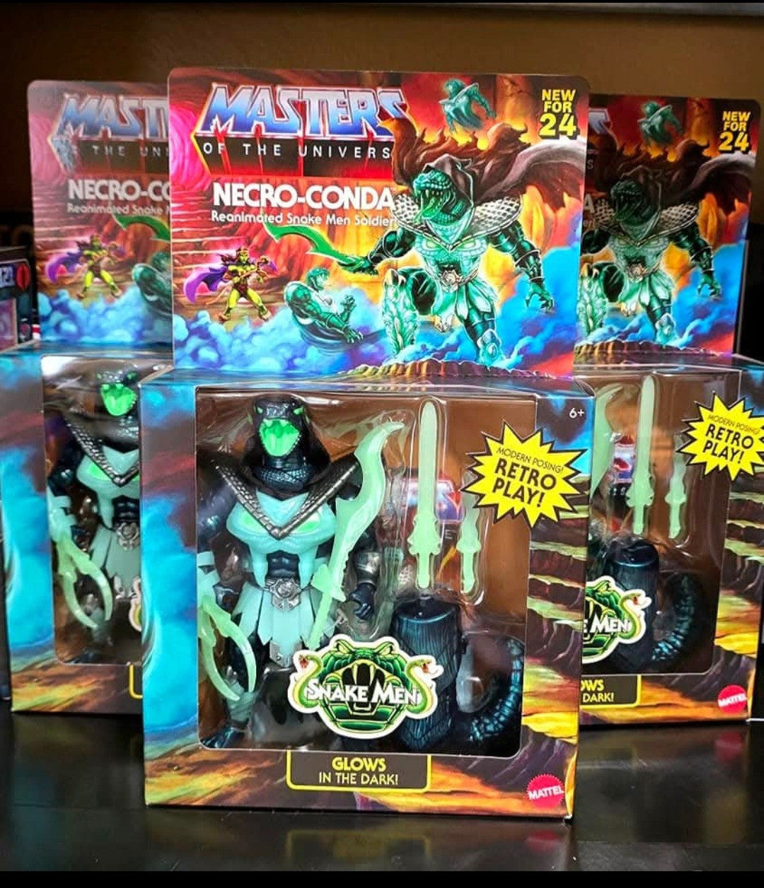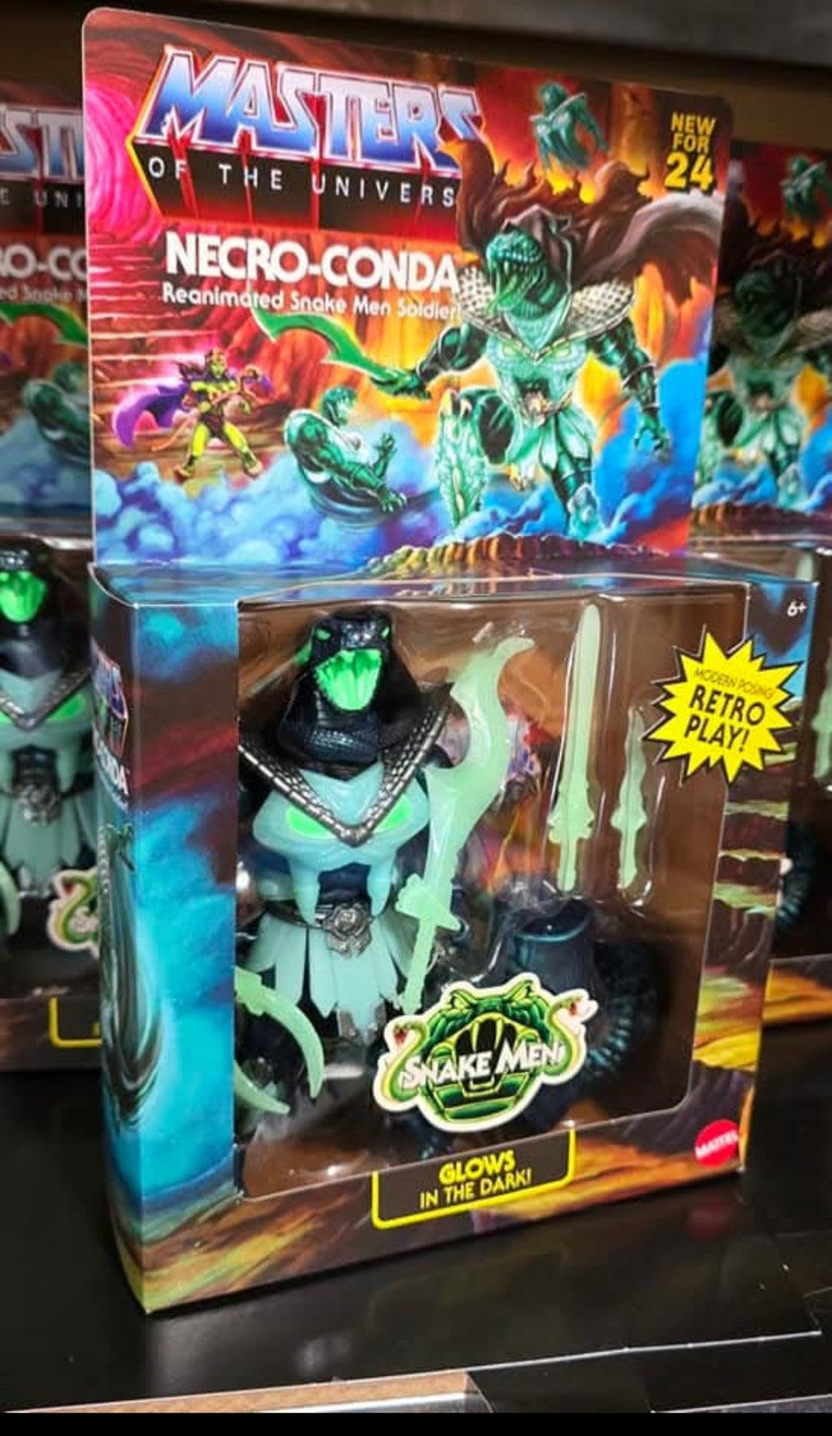 The MOTU Origins Masters of the Universe NECRO-CONDA Action Figure is a Walmart Exclusive item from the Mattel brand. This glow-in-the-dark plastic action figure is part of the Motu Origins series, featuring the character NECRO-CONDA from the Masters of the Universe franchise. Created in 2024, this figure is suitable for ages 6 and up, and is inspired by the TV show "Masters of the Universe." The figure represents the SNAKE MEN model and is part of the Motu Origins theme, showcasing the featured person/artist Necro-Conda.