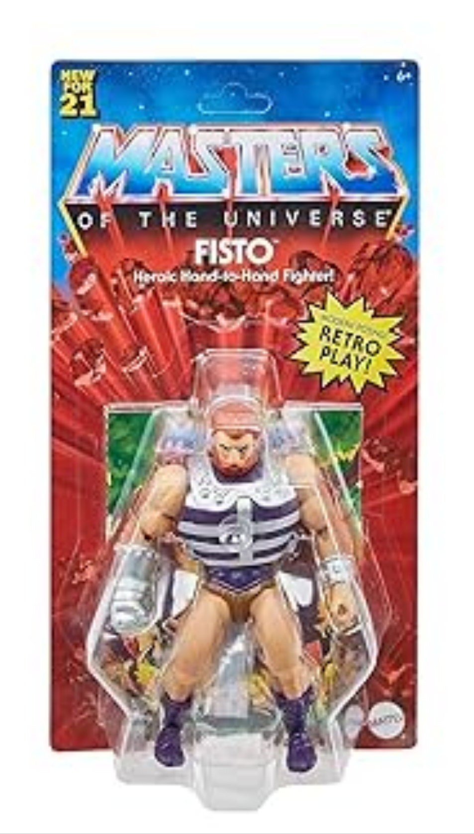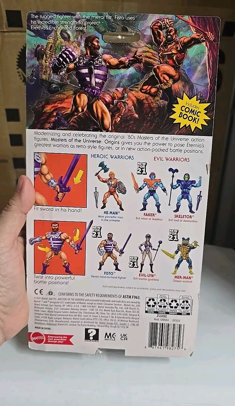 This is a 2021 Mattel action figure from the "Masters of the Universe" series, featuring the character Fisto. Standing at 11.38 inches tall and designed in a retro style, this plastic figure is part of a 1:12 scale collection suitable for ages 6 and up. Inspired by the "He-Man and the Masters of the Universe" TV show, this multicolored figure is an original licensed reproduction that pays homage to the popular franchise. Perfect for fans of the series, this action figure is a great addition to any collection or for imaginative play.