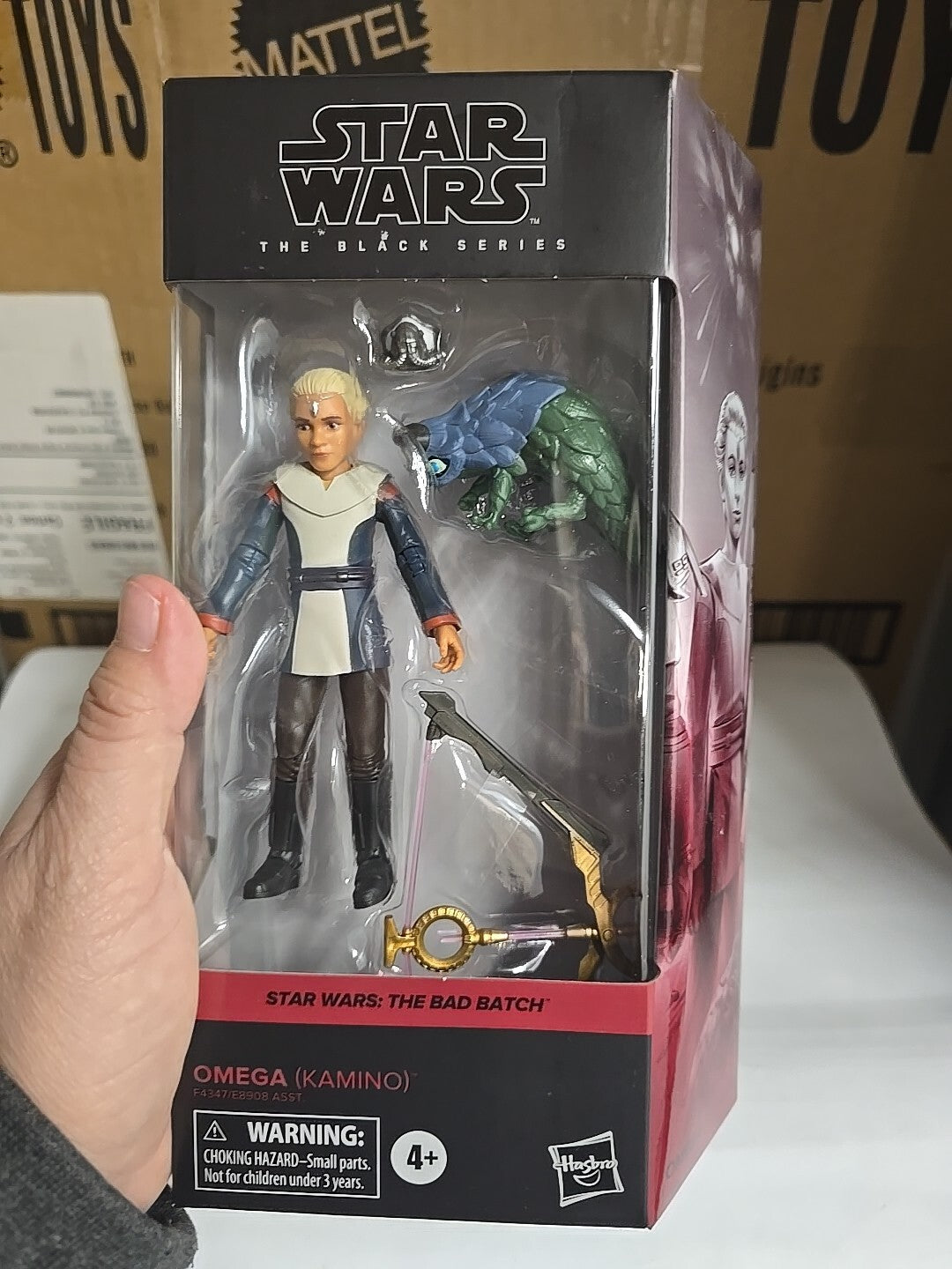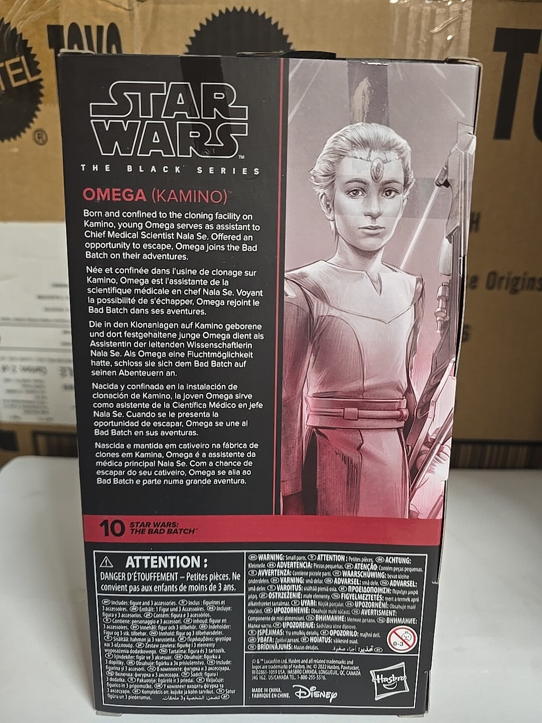 The "Star Wars The Black Series Omega 6-Inch Action Figure" is a collector's edition toy based on the character Omega from the "Star Wars: The Clone Wars" animated series. Manufactured by Hasbro in 2022, this action figure features Omega in her Kamino outfit, standing at 9 inches tall with a 1:12 scale. The figure is made of ABS plastic and includes detailed accessories such as clothes and a boxed packaging. This item is part of the Star Wars franchise and is a must-have for fans of the series looking to add to their collection.