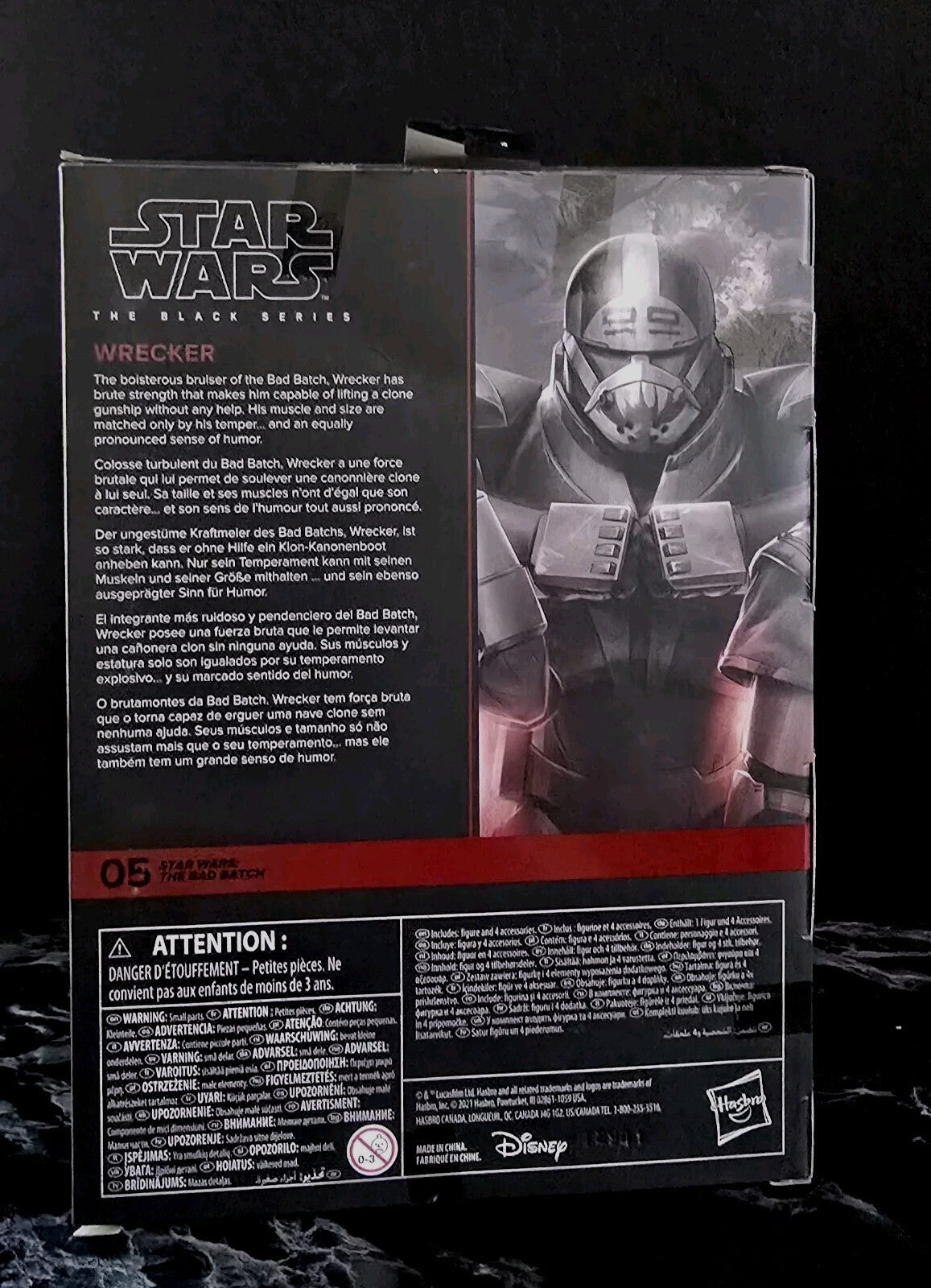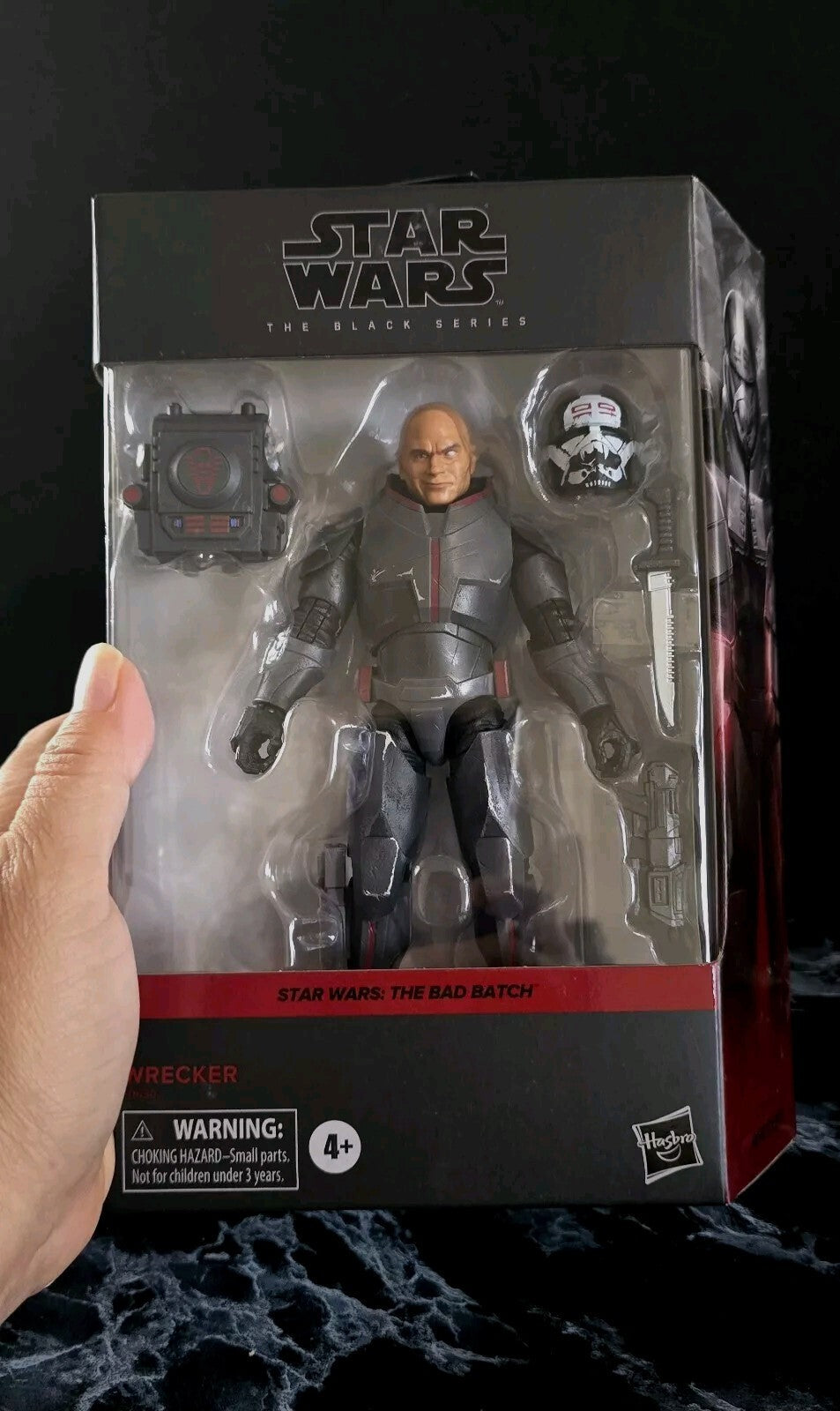 Introducing the Star Wars The Black Series The Bad Batch Wrecker Deluxe 6" Action Figure (F0630). This highly detailed collectible is a must-have for any Star Wars fan. The figure features Wrecker, a character from the popular Star Wars franchise, in a 1:12 scale with a black plastic material.