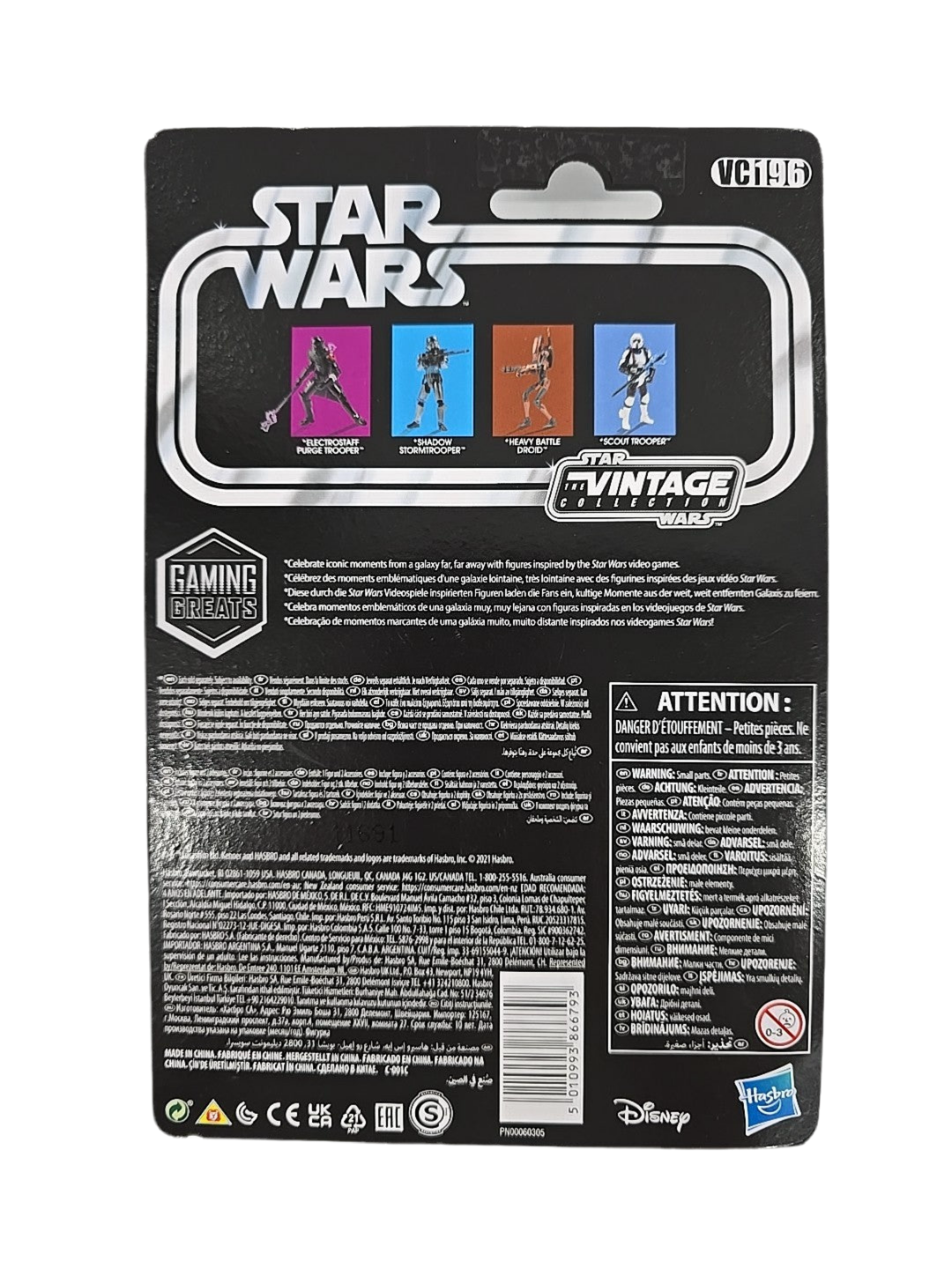 The Star Wars The Vintage Collection Shock Scout Trooper 3.75" figure is a highly collectible action figure based on the popular Star Wars franchise. This figure features the menacing Shock Trooper character from the Star Wars movies, making it a must-have for any fan of the series. With its detailed design and nostalgic appeal, this toy is sure to be a prized addition to any Star Wars collection.